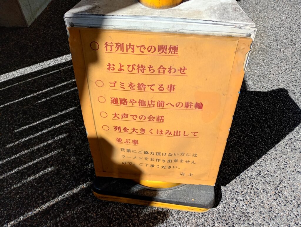 お昼時の訪問でしたが、幸いにも待ちは数名ほど。 こちらのお店は近隣への配慮から並びのルールが徹底されており、店頭の掲示に従って静かに順番を待ちます。