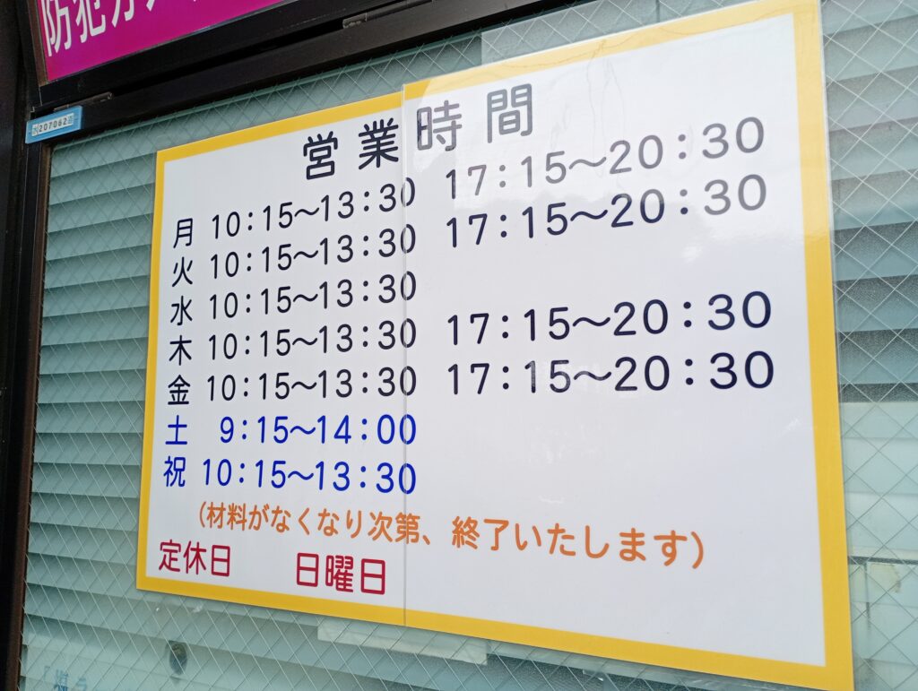 | 営業時間 | 【平日】10:15~13:30 / 17:15~20:30 【土曜】09:15~14:00頃(※売切次第終了) |