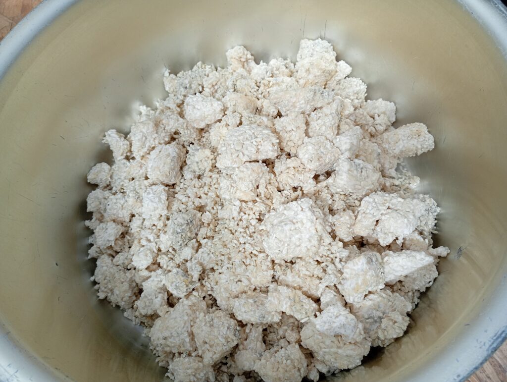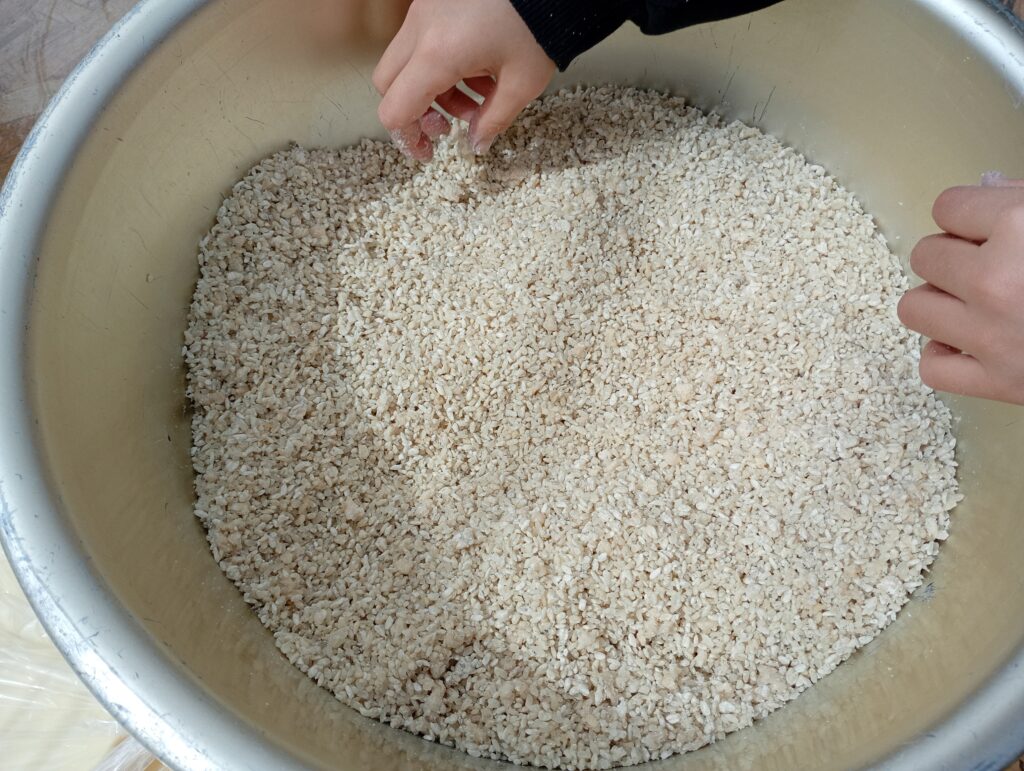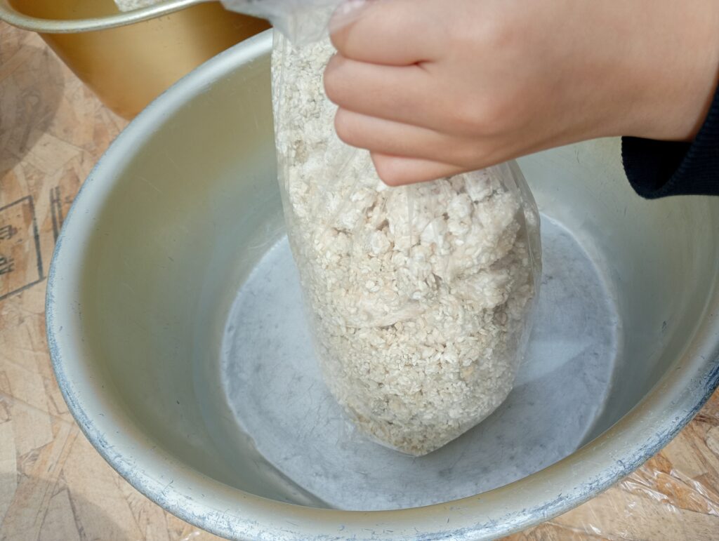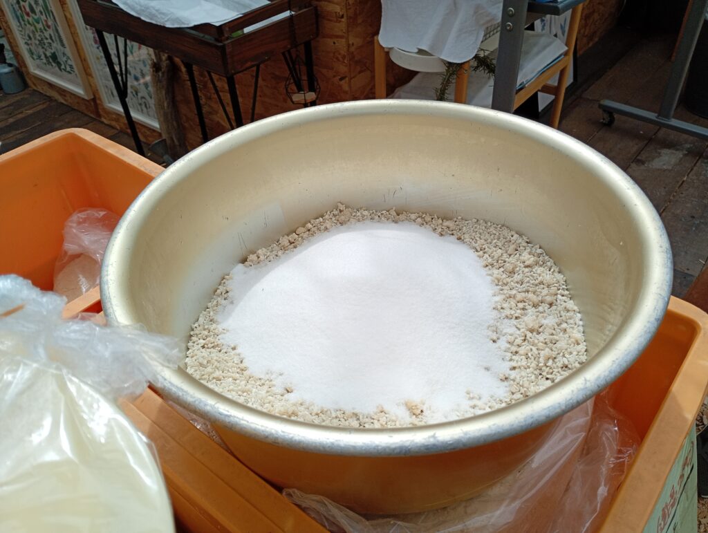 塩切こうじ: 麹をよくほぐし、塩とムラなく混ぜ合わせます。