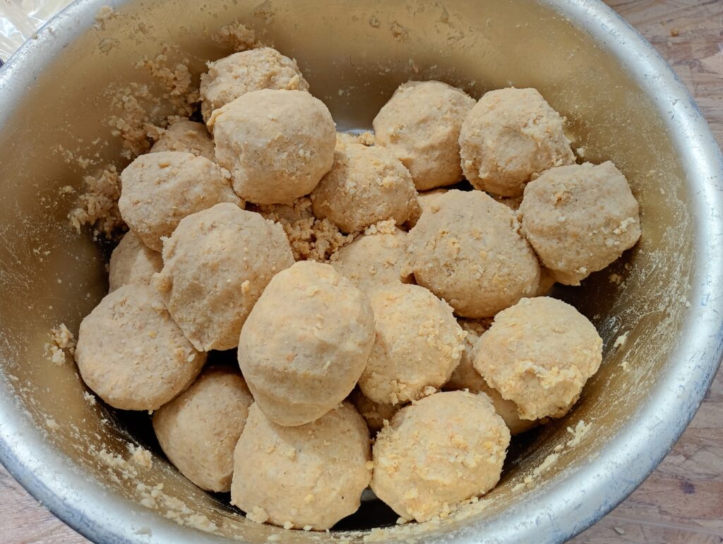 攪拌(かくはん): 煮大豆、塩切こうじ、煮汁を合わせ、根気よく練り込みます。