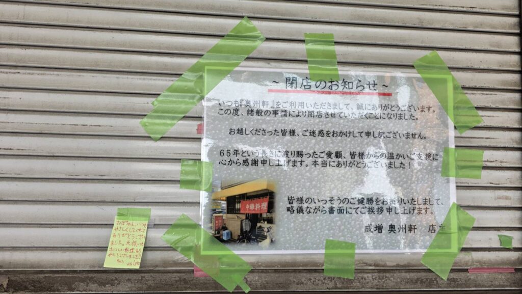 東武東上線成増駅から光が丘方面に暫く進んだ成増一町目の住宅街の少し奥まった場所に中華料理「奥州軒」が65年にわたり軒を構えていました。