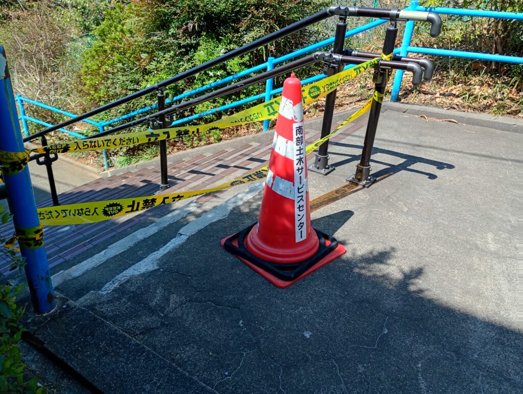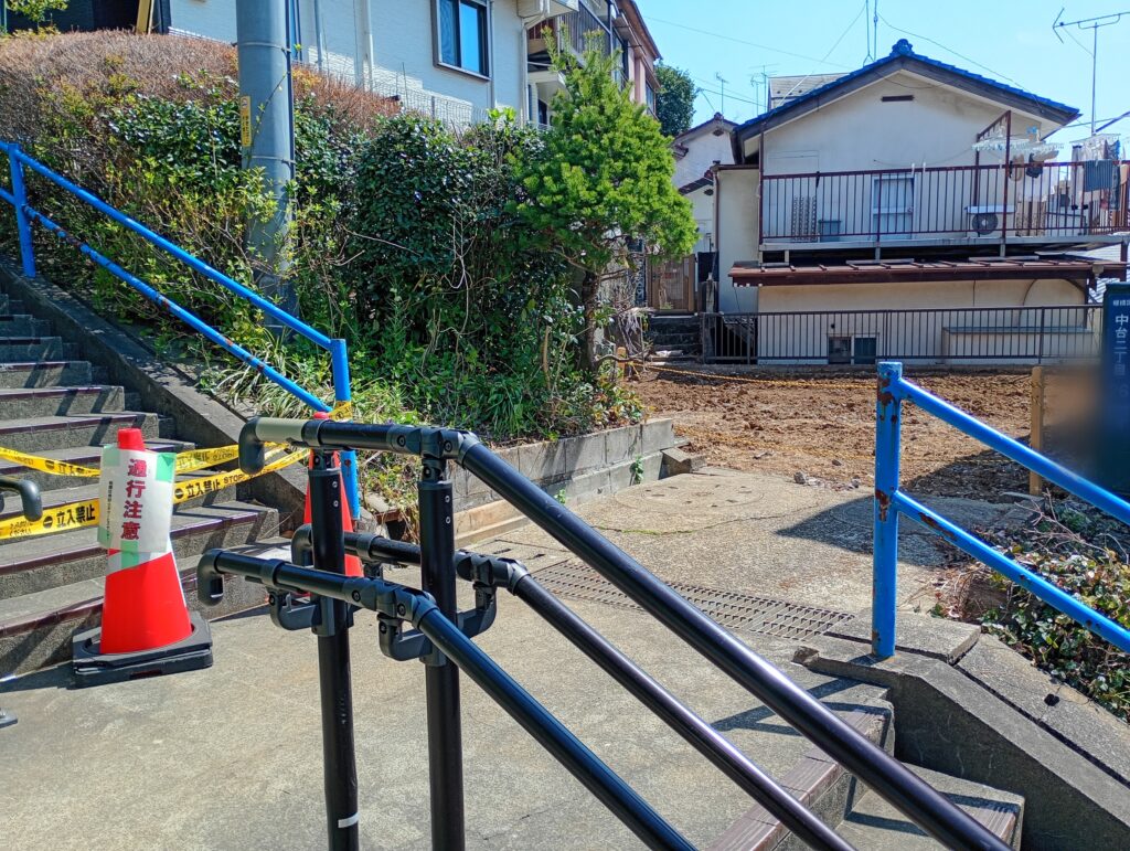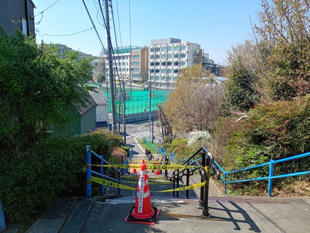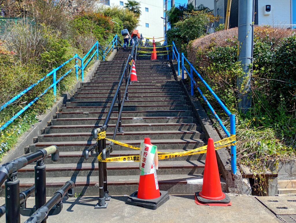 最大の問題は、現場が子供たちの通学路である点です。現在、階段には立ち入り禁止のテープが施されていますが、脇をすり抜けて階段を上り下りする小学生の姿も散見されます。