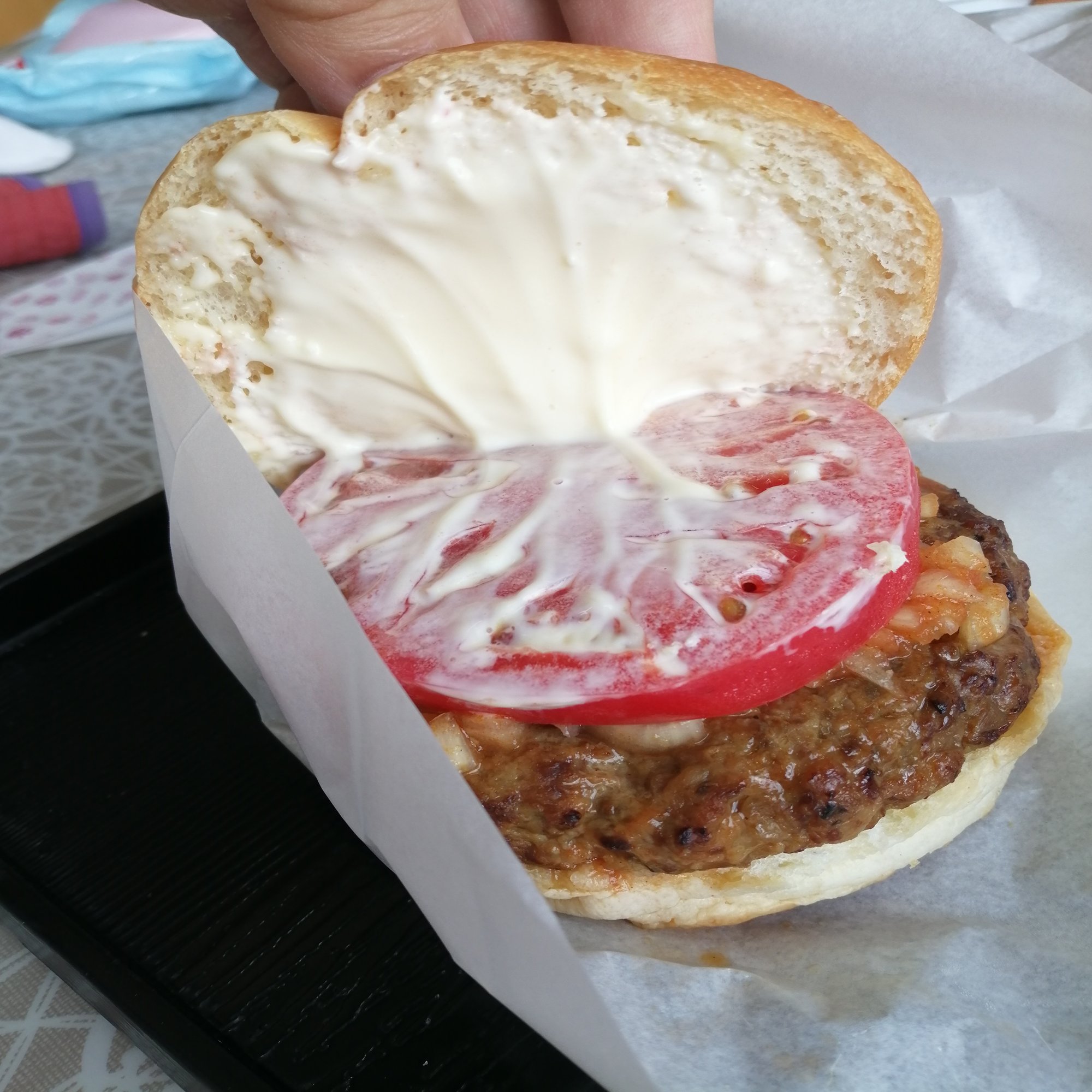 こちらの道の駅は馬鹿バーガーが有名だそうで、馬と鹿の肉のパテはとてもおいしかった。モスバーガーみたいなかんじです。