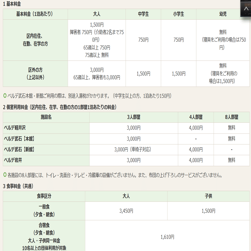 今回の宿泊でもベルデ武石では夕食がなかったので家族で1万円程度、ベルデ軽井沢は夕食込みで15,000円程度で宿泊することができました。とても安かったです。