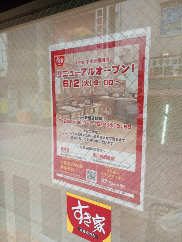 【休店】2026年3月25日「牛丼すき家下赤塚駅前店」が休店、6月2日にリニューアル予定。 投稿日 2026年3月28日 著者 なりチャン カテゴリー グルメ カテゴリー ニュース カテゴリー 下赤塚 カテゴリー 地域別情報 カテゴリー 板橋情報(東武東上線) カテゴリー 開店/閉店 投稿 下赤塚駅南口改札の眼の前の一等地にある牛丼すき家下赤塚駅前店が2026年3月25日に休店となります。リニューアルオープンは2026年6月2日になります。 近隣のすき家は成増店や氷川台駅前店になります。 この記事を書いた人 なりチャン なりますチャンネルは、成増をベースに東京の城北エリア(板橋・練馬)の地域情報を地元目線でリアルタイムにお届けしていきます✉「子どもたちが地域の方々と触れあい、地域をもっと好きになってほしい」という想いで2022年頃に始めました。月間55万PV(2026年1月)。 記事一覧 X Instagram YouTube