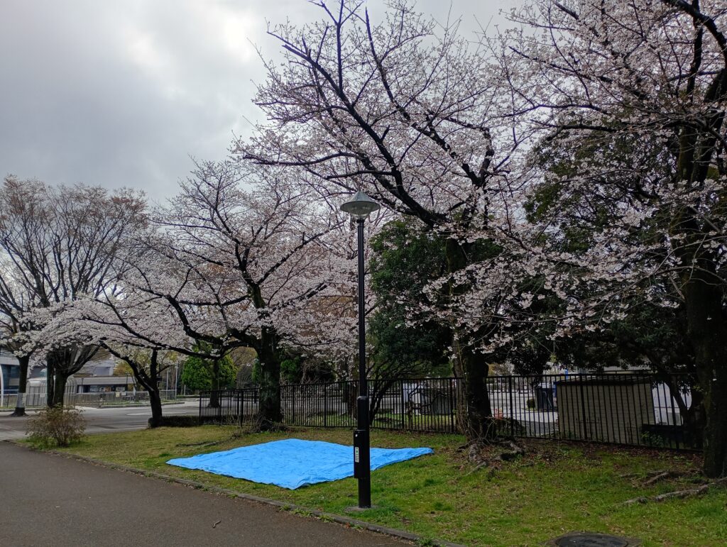 芝生広場の大桜の樹の下にはビニールシートを敷いてお花見の準備をする方がおられました。
