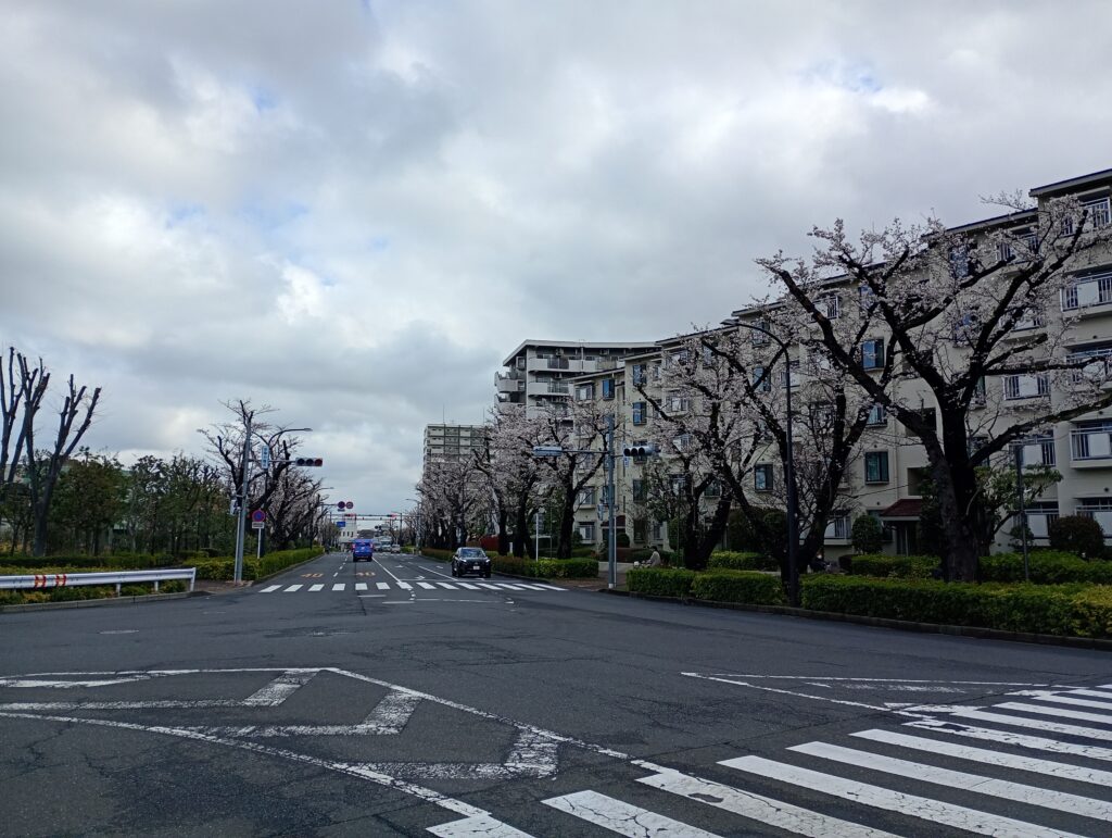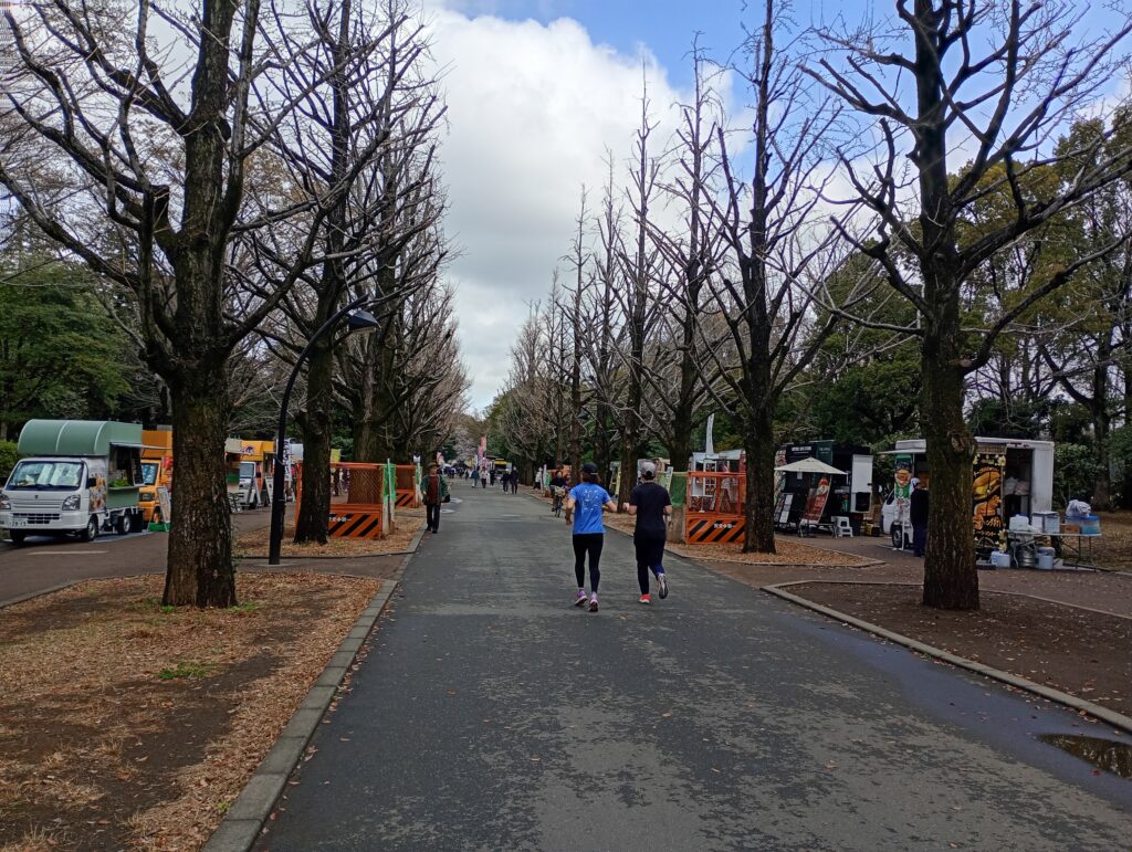桜並木もご覧の通りです。多くのランナーの方がジョギングをされており、また、ウエディングドレスの写真を取る方、ランドセルを背負った新1年生の姿などもありました。
