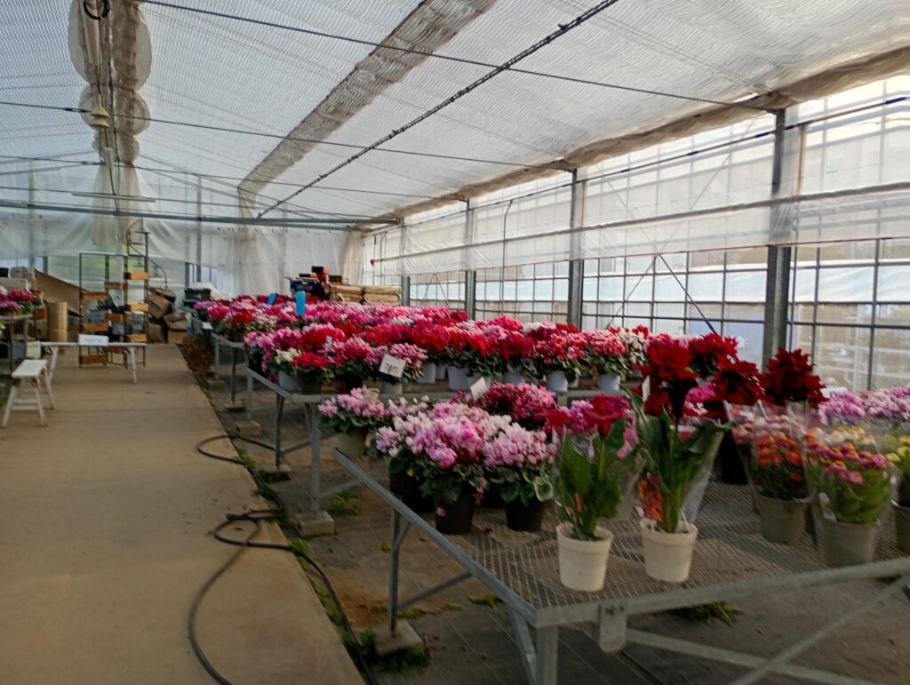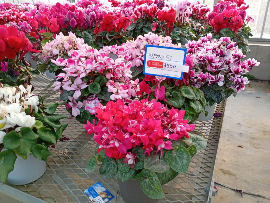 シクラメンの栽培が有名だそうで、ビニールハウスの中には色味やサイズが異なる様々なお花が展示されていました。