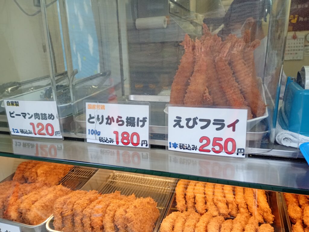 店頭には揚げたてのフライがたくさん並んでいます。どれも美味しそうです。
