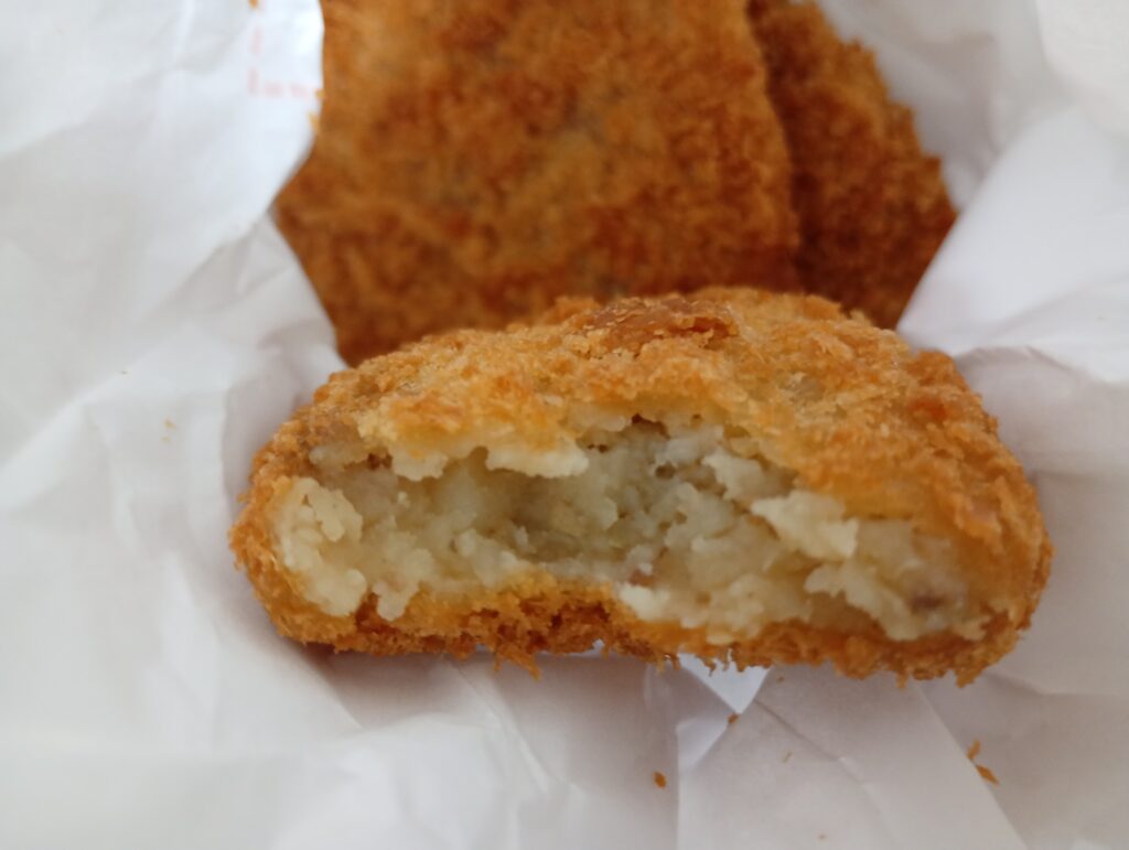こちらが人気のコロッケ110円。令和の時代にコロッケがこの値段で食べられるのはありがたいです。しかも、肉の旨味が詰まったボリューム満点の一品です。