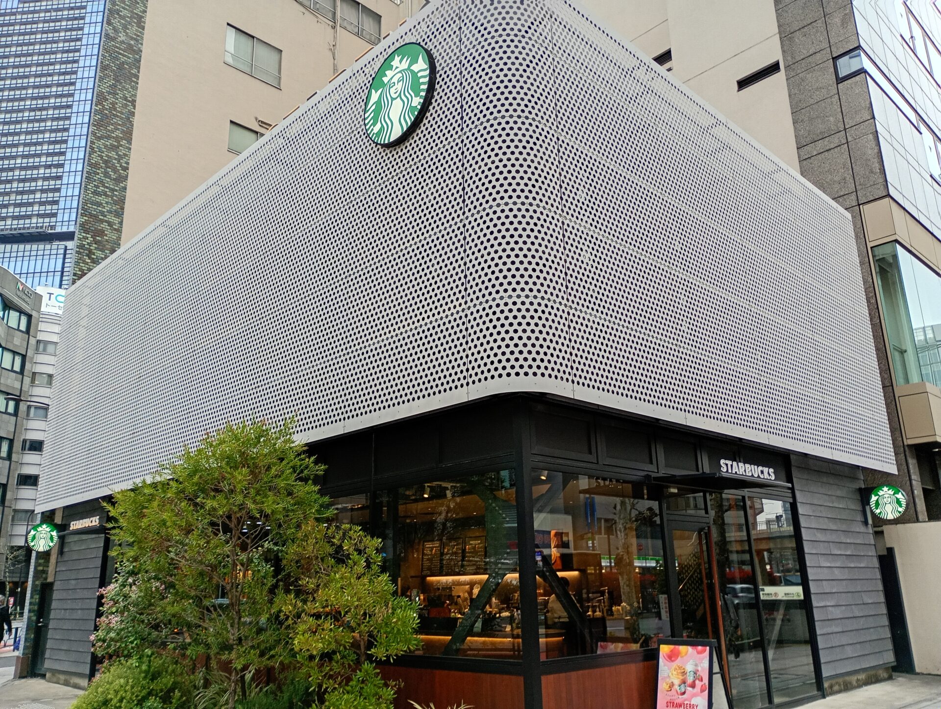 東京メトロ丸の内線・淡路町駅のほど近く、オフィスビルが立ち並ぶ神田淡路町エリア。ビジネスパーソンが行き交うこの街の交差点角に、ひときわ目を引くおしゃれな外観の「スターバックス コーヒー 淡路町駅前店」があります。