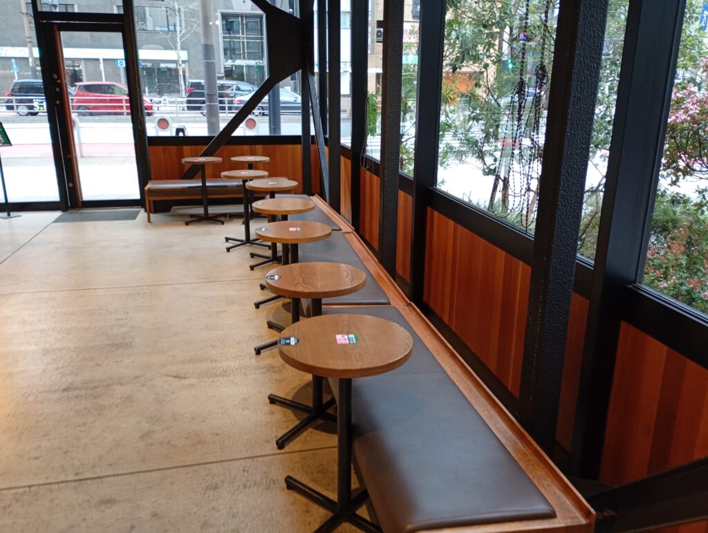 落ち着いた客層: オフィス街のため平日は仕事中の利用者が多く、比較的静かで落ち着いた雰囲気です。逆に、週末はゆったりとした時間を過ごす人で賑わう傾向があります。
