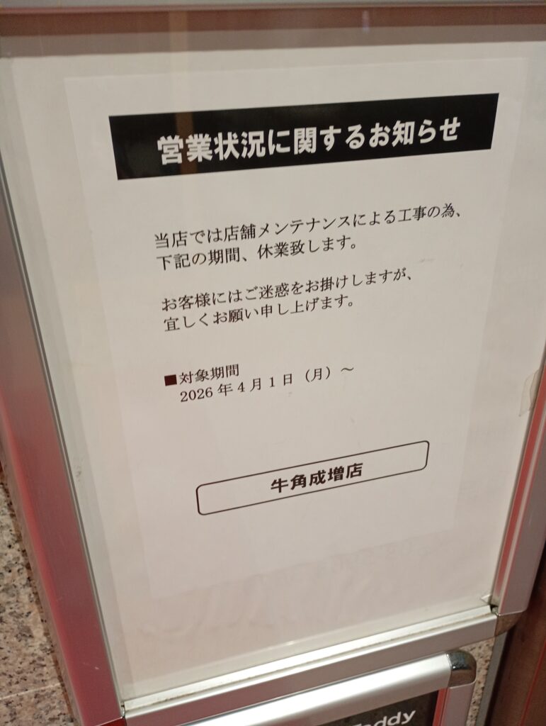 板橋駅前の店舗に続き、成増店までもが閉店かと思いましたか、メンテナンスに伴う休業とのことです。