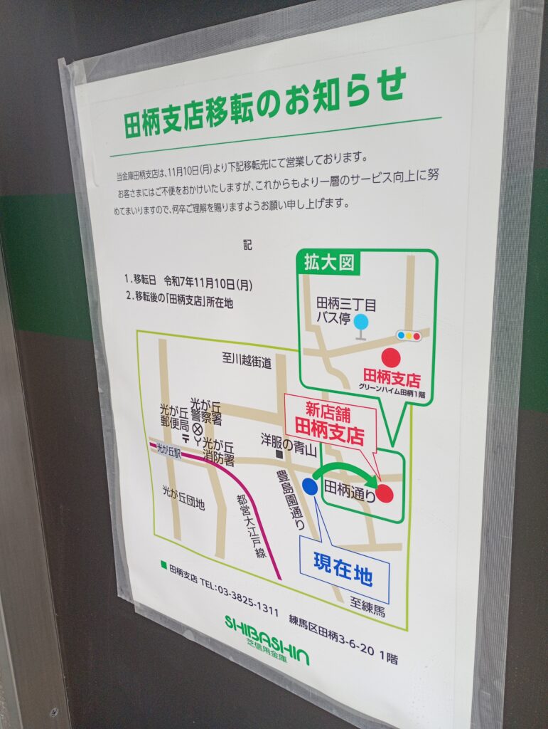 カフェの向かいにある芝信用金庫田柄支店ですが2028年11月に移転してしまい、元の店舗はがらんとしています。