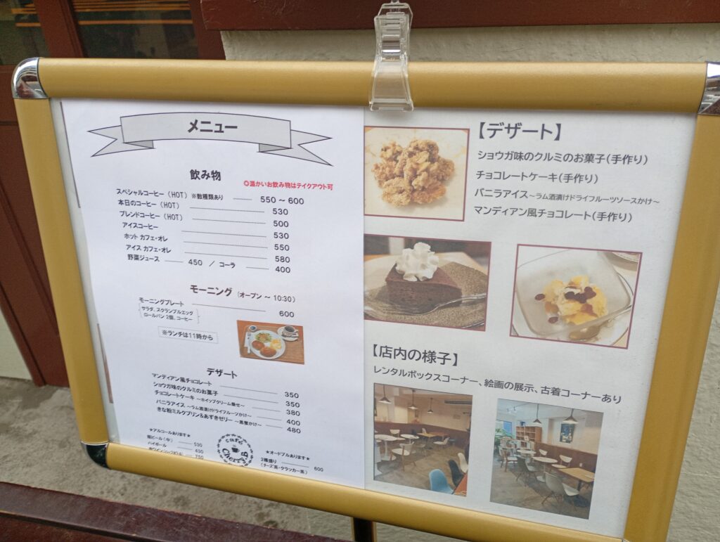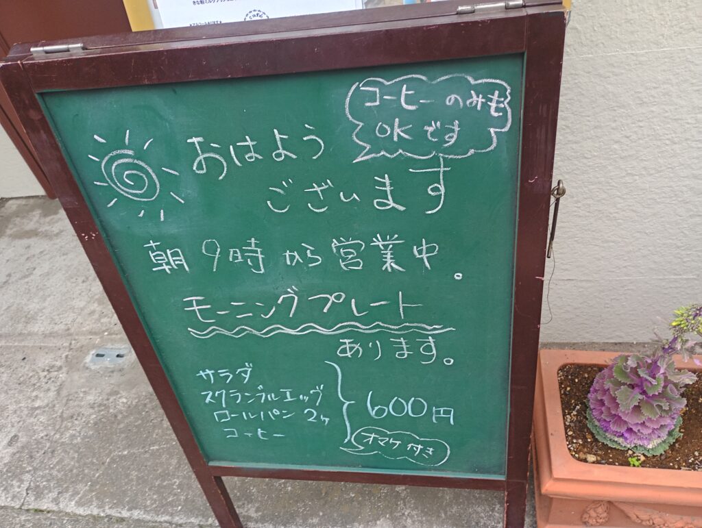 モーニング、ランチ(生姜焼きプレート、ナポリタン、オムライスなど)、手作りデザート、コーヒーを提供しています。今回はモーニング600円を注文。
