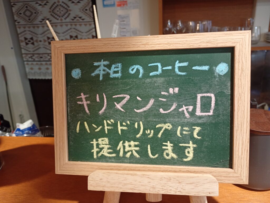 本日のコーヒーはキリマンジャロのハンドドリップ。丁寧に淹れられた一杯。苦味と酸味のバランスが良く、目がシャキッと覚めます。