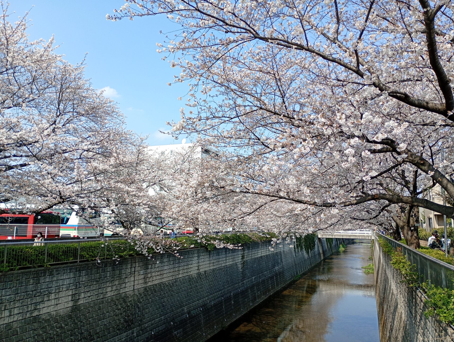 川沿いに出ると、見事な桜が出迎えてくれます。 階段に腰を下ろしてのんびりと花を眺める人、カメラを手に散策を楽しむ人。