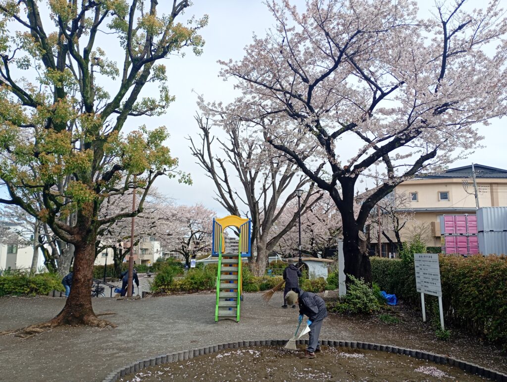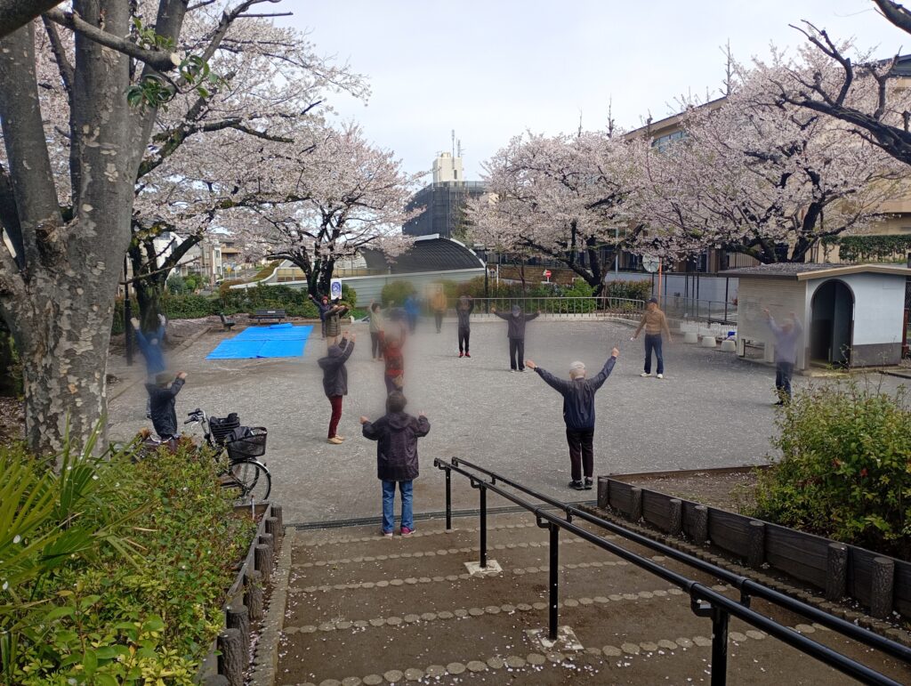 取材当日は満開の桜が公園を彩り、清掃後は恒例のラジオ体操が行われました。その後には町会の花見イベントも開催され、ゴミのない綺麗な空間で住民たちが笑顔を交わす光景が見られました。
