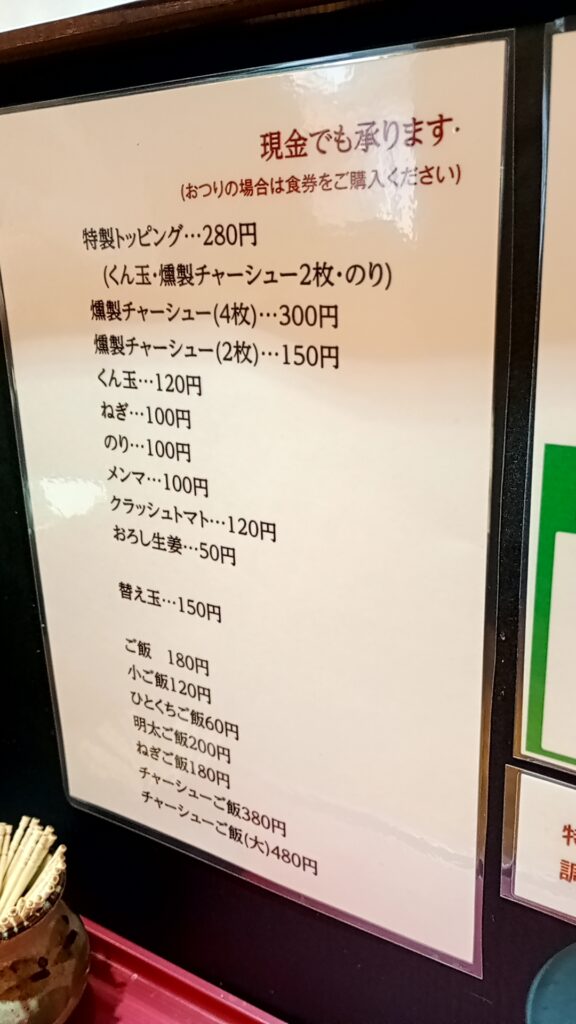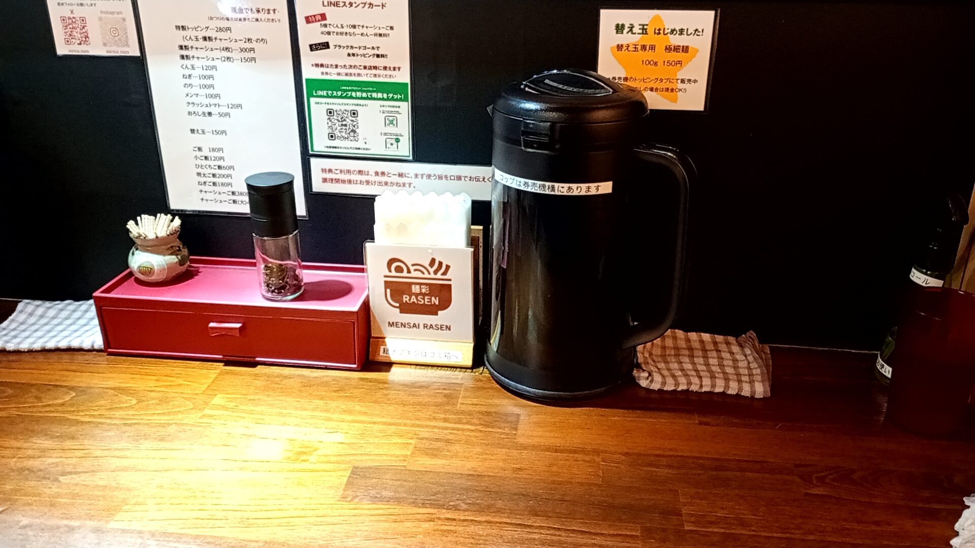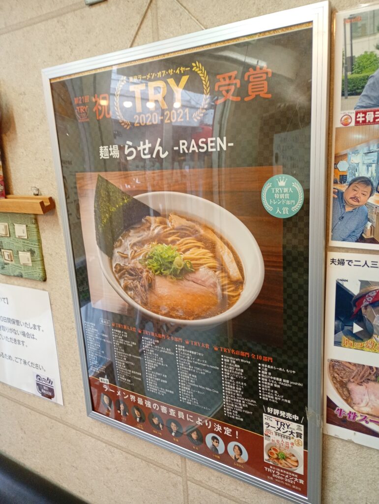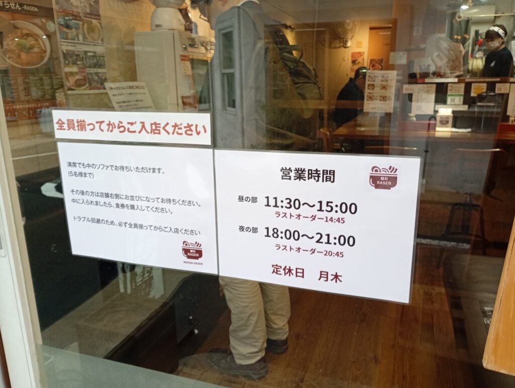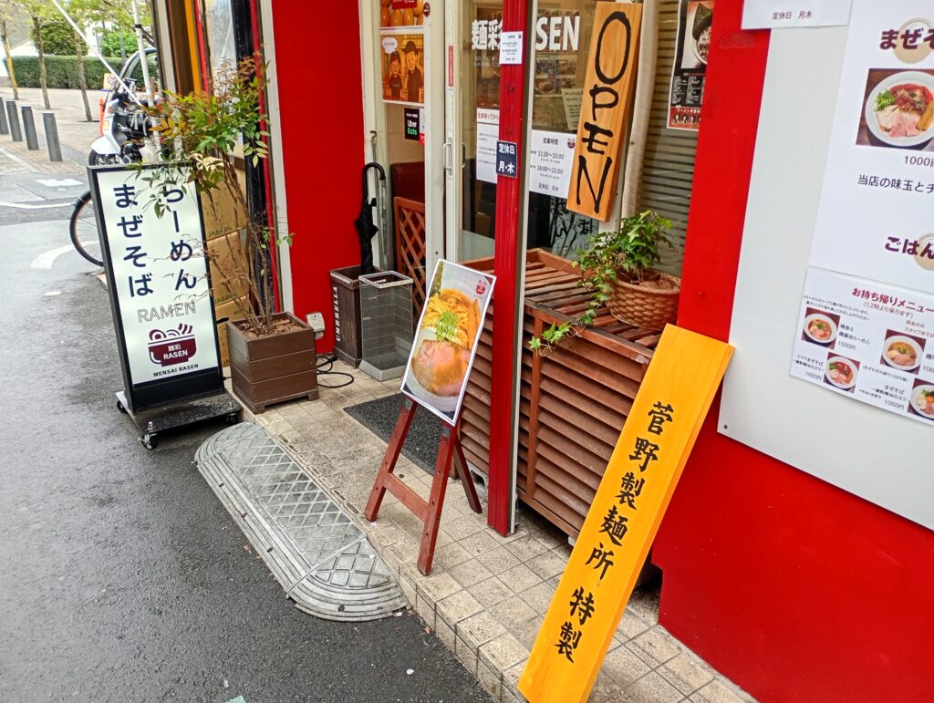 駅北口から徒歩20秒という好立地はそのままに、看板は新しいロゴの「麺彩RASEN」へ。店頭には新しくなった「菅野製麺所」の看板も掲げられており、製麺所との強固なタッグが伺えます。