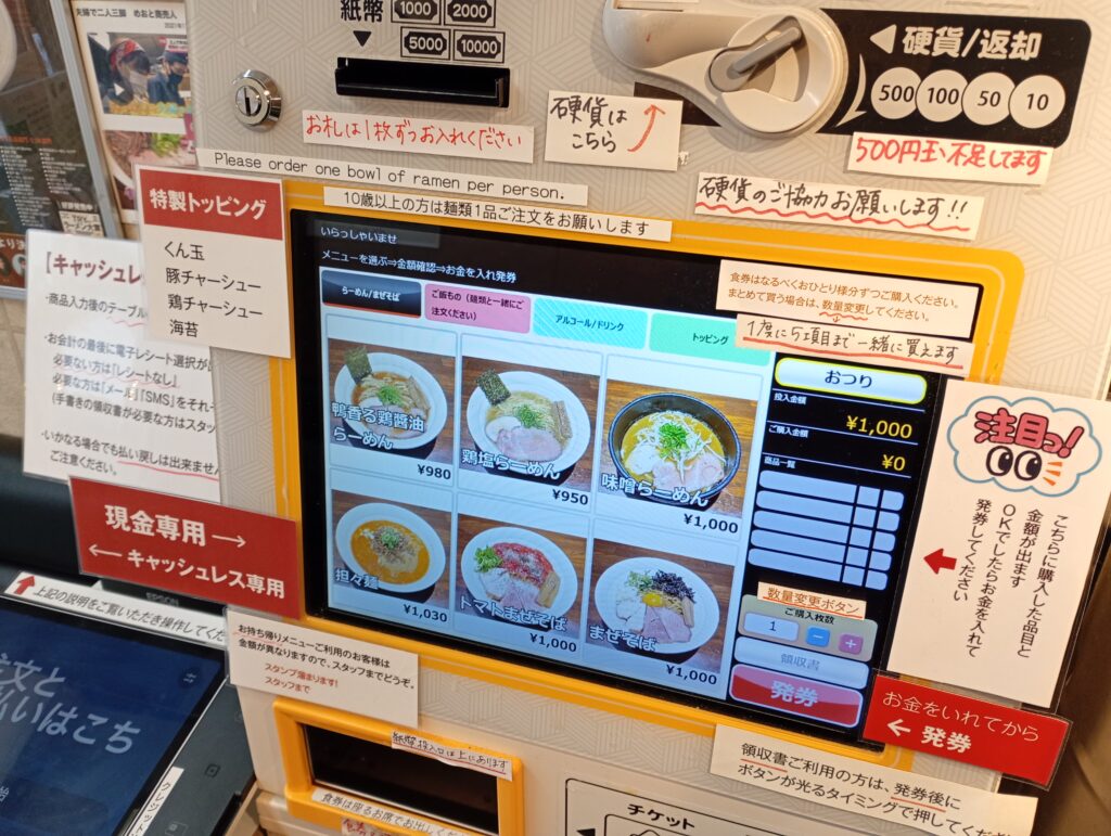 心機一転、券売機(キャッシュレス導入済み)に並ぶのは、鶏をベースにした魅力的なメニューたちです。