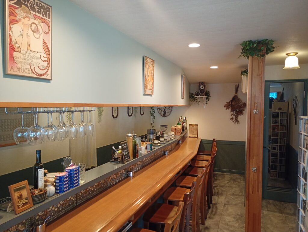 モスグリーンのテントと赤い瓦が目印の民家一階。扉を開ければ、そこには外の明るさとは対照的な、ジャズが流れるシックな大人の空間が広がっていました。