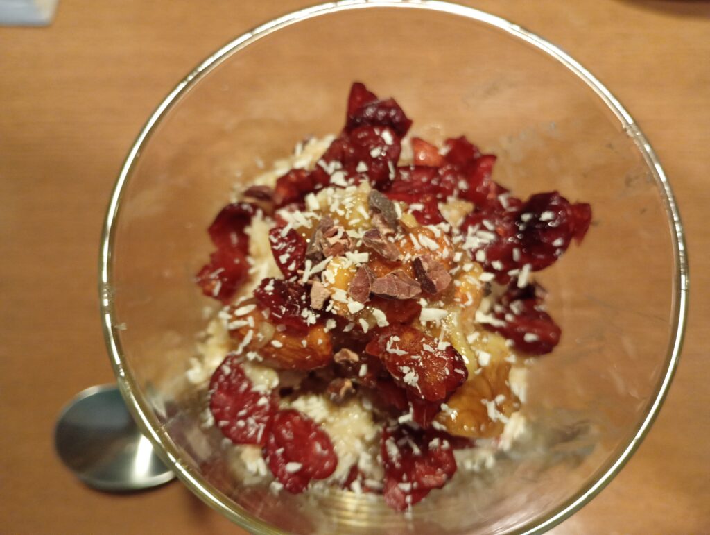 - トッピング: クランベリーと、じっくり漬け込んだハニーナッツ。仕上げにメイプルシロップを。