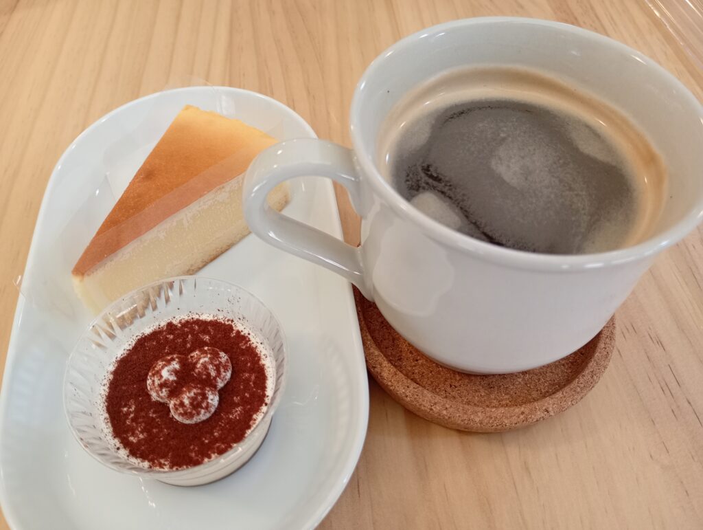 - コーヒーとチーズケーキ しっとりとしたチーズケーキはコーヒーとの相性抜群。この日はオープン記念で、なんとティラミスも添えられていました!