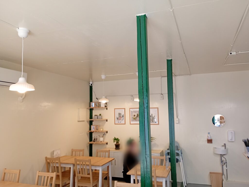 - こだわりの内装: 中央にある間仕切り(建物の躯体)を活かし、おしゃれなモスグリーンにペイント。