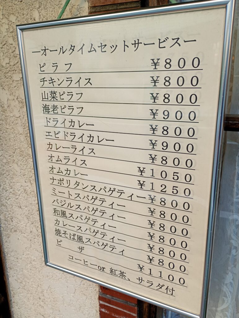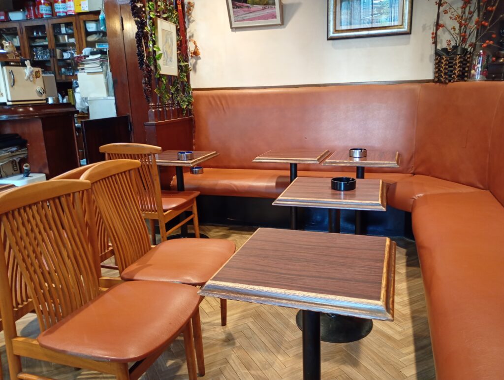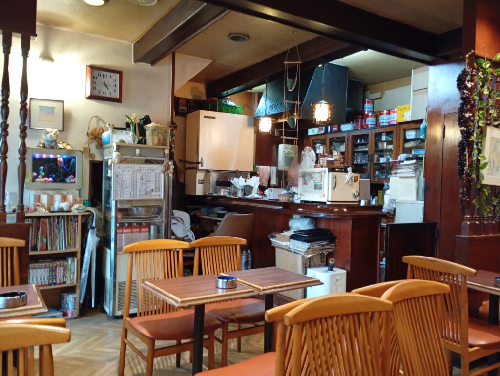 一歩足を踏み入れると、そこには期待通りの「昭和レトロ」な空間が広がっています。 コーヒーカップにナイフとフォークがあしらわれた、趣のあるアルファのロゴマーク。使い込まれた木製の机と椅子が、お店の歴史を無言で語りかけてきます。