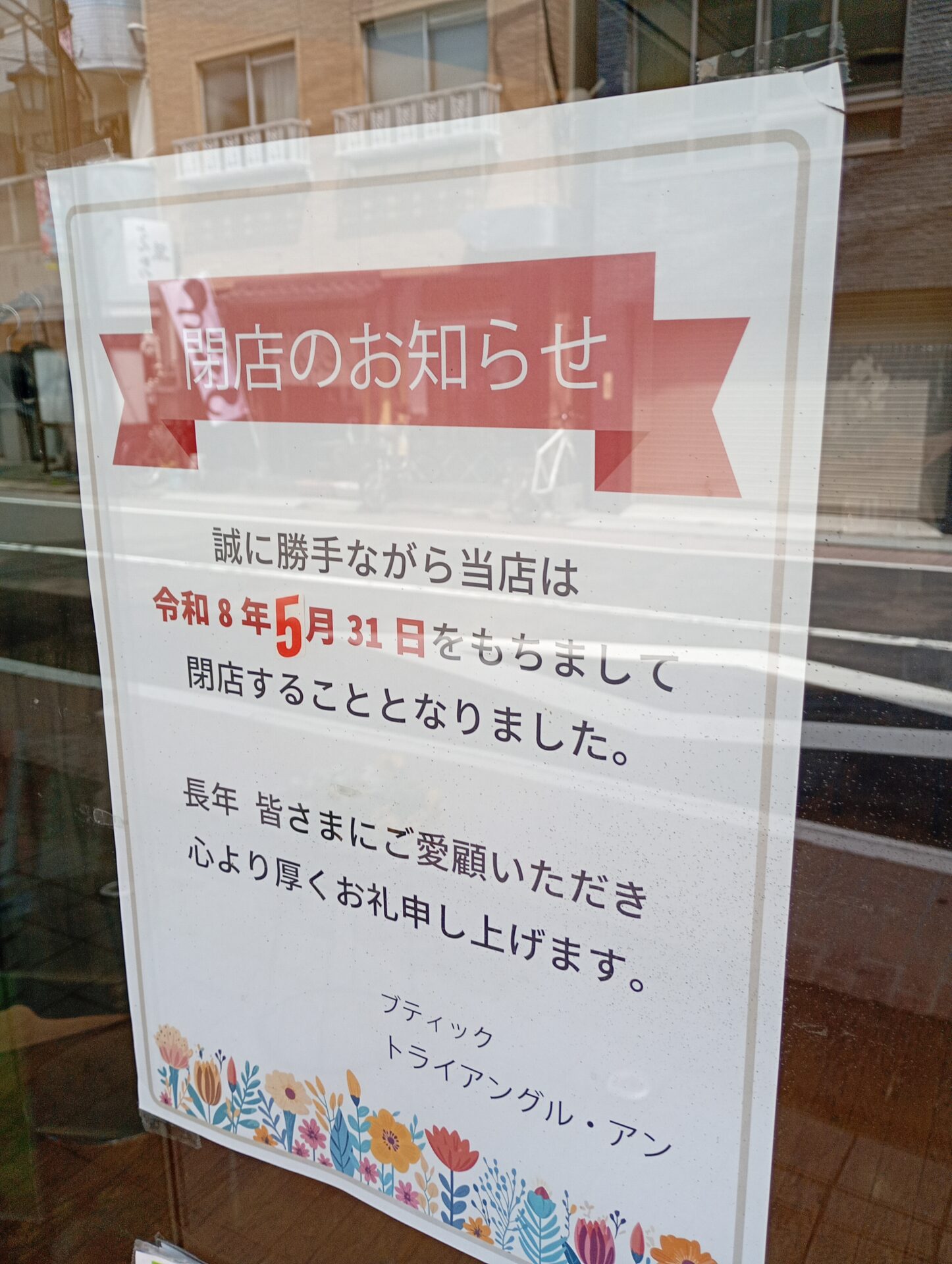 中板橋駅から板橋本町駅へと続く、かつての賑わいを知る「愛染(あいぞめ)通り」。 その通り沿いで、40年以上にわたり上質なファッションを提案し続けてきた「ブティック トライアングル・アン」が、2026年5月31日をもって閉店します。