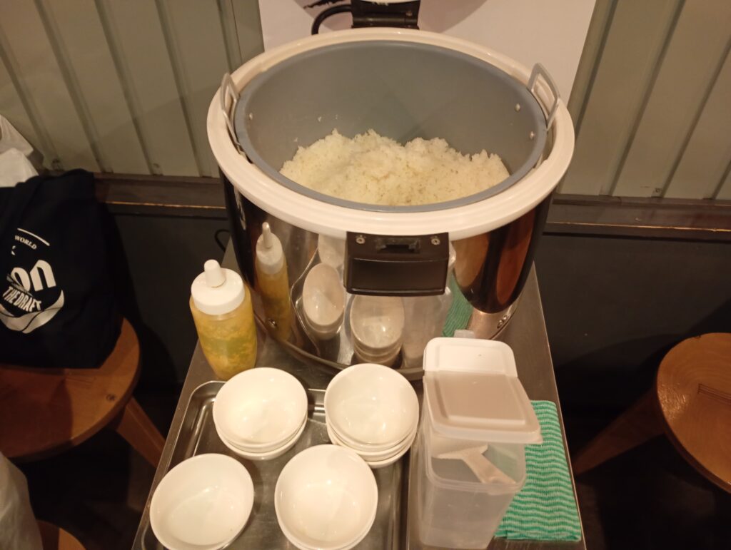 花木流といえば、なんといってもライス食べ放題。セルフサービスなので、店員さんに気を遣うことなく、大きなジャーからお好みの量をよそえます。ふりかけや漬物まで完備されています。