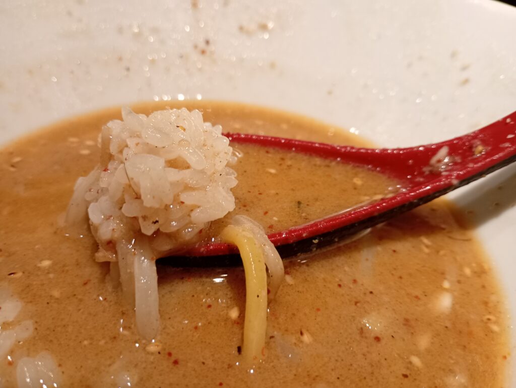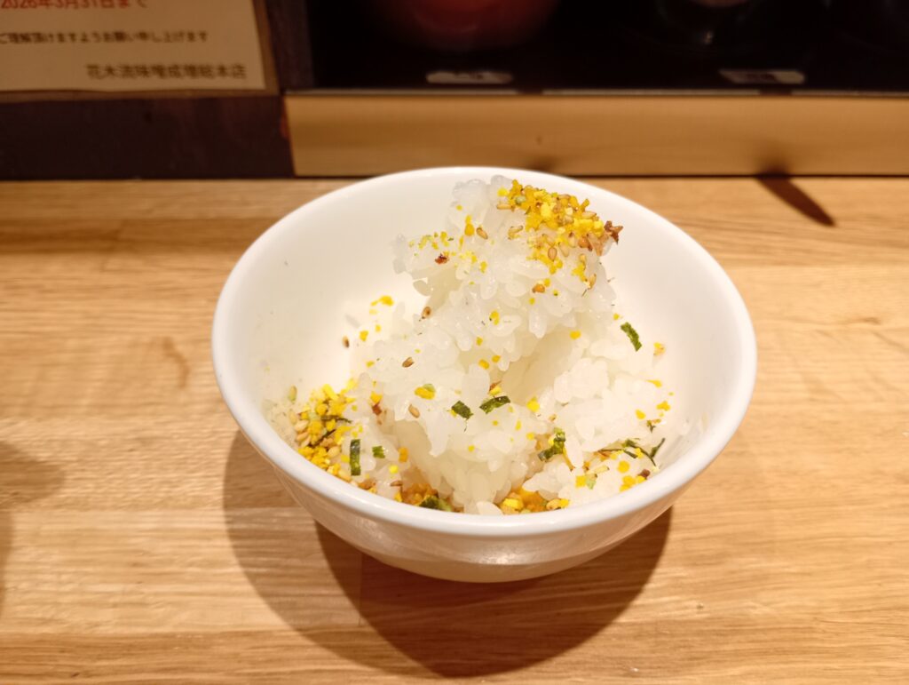 少し硬めに炊かれたライスが、この濃厚スープに合わないはずがありません。 スープに浸したチャーシューをバウンドさせ、ふりかけをかけたご飯をかき込む……。