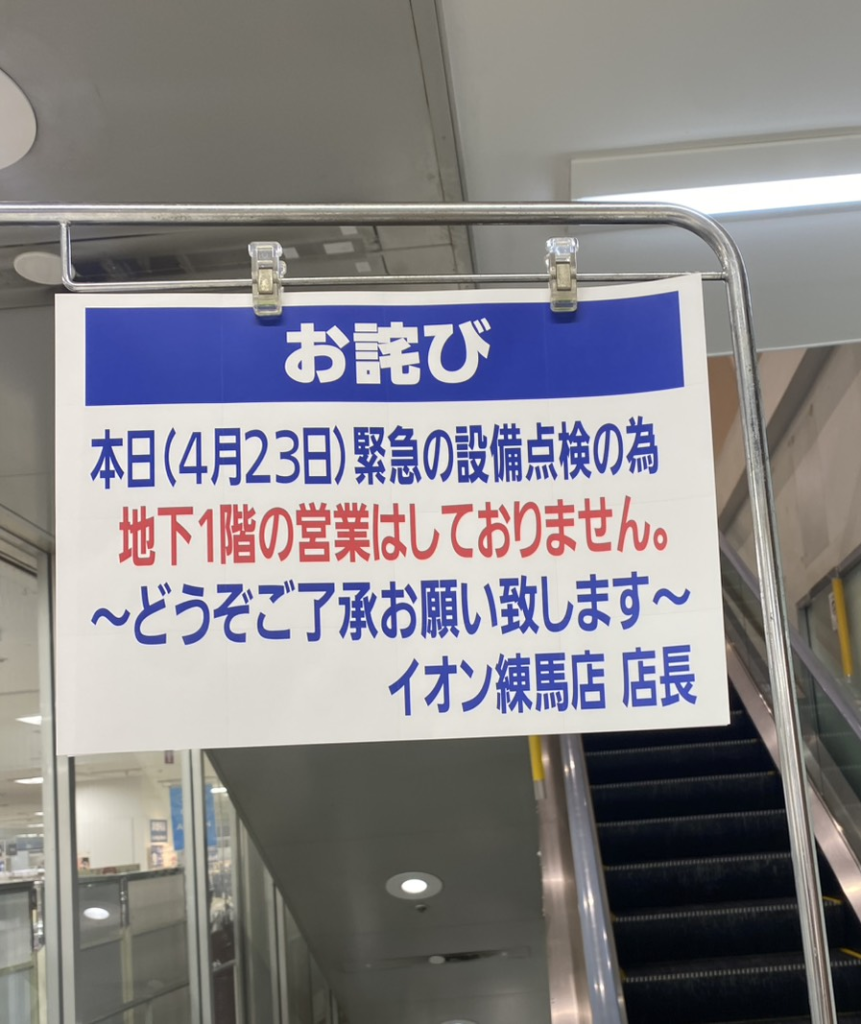 イオン練馬店は、今回の事案を「設備不良」としており、地下1階以外のフロアについては通常通り営業を継続しています。