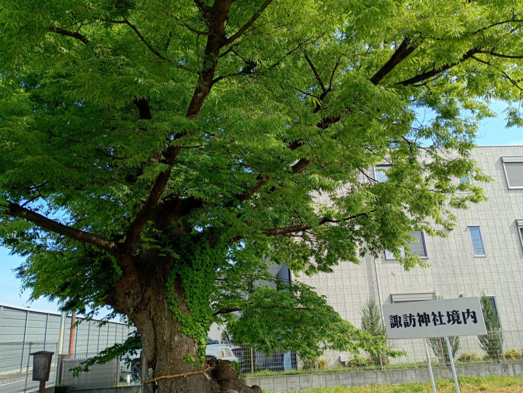 かつては広大な境内を誇った諏訪神社も、新大宮バイパスの開通によってその姿を変えました。今もバイパス沿いに残る一本の大木が、かつての参道の長さを静かに物語っています。