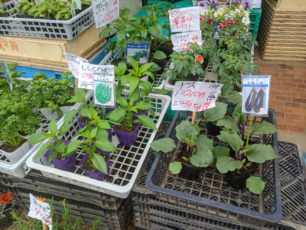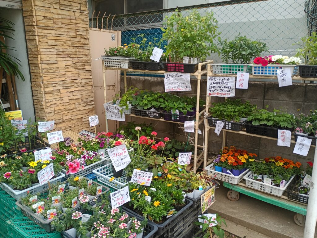 春先になると、野菜の苗がずらりと並びます。近隣の区民農園や家庭菜園を楽しんでいる方々にとって、ここは欠かせない補給基地。植木鉢などの資材も良心的な価格で手に入るため、初心者からベテランまで幅広い層で賑わいます。