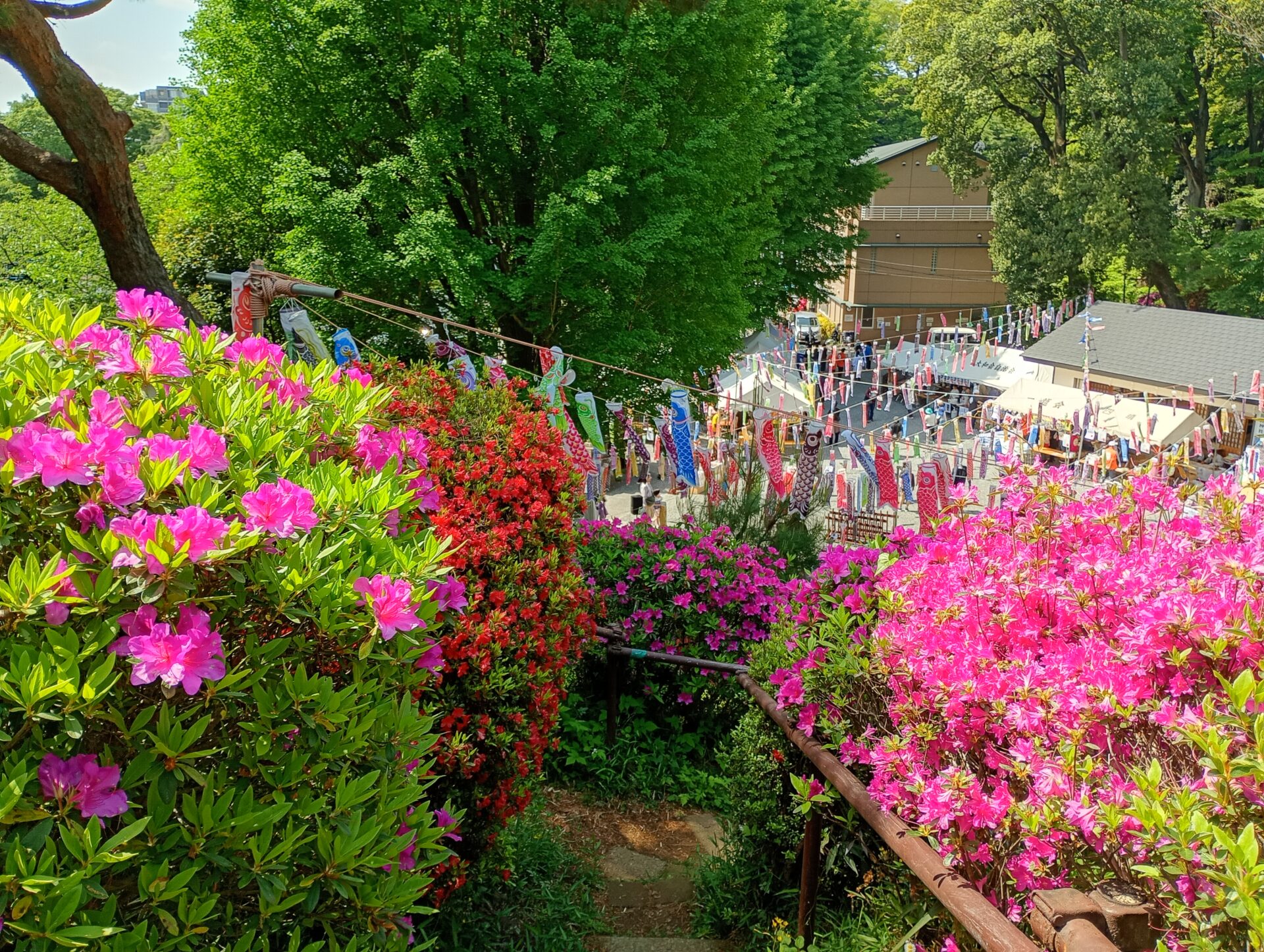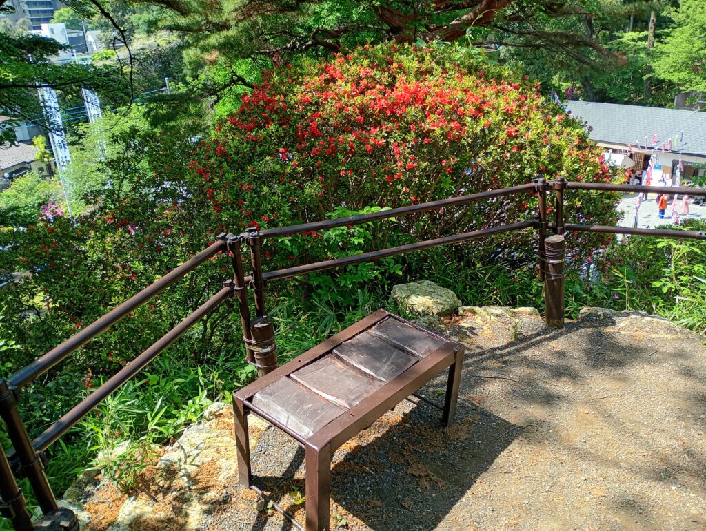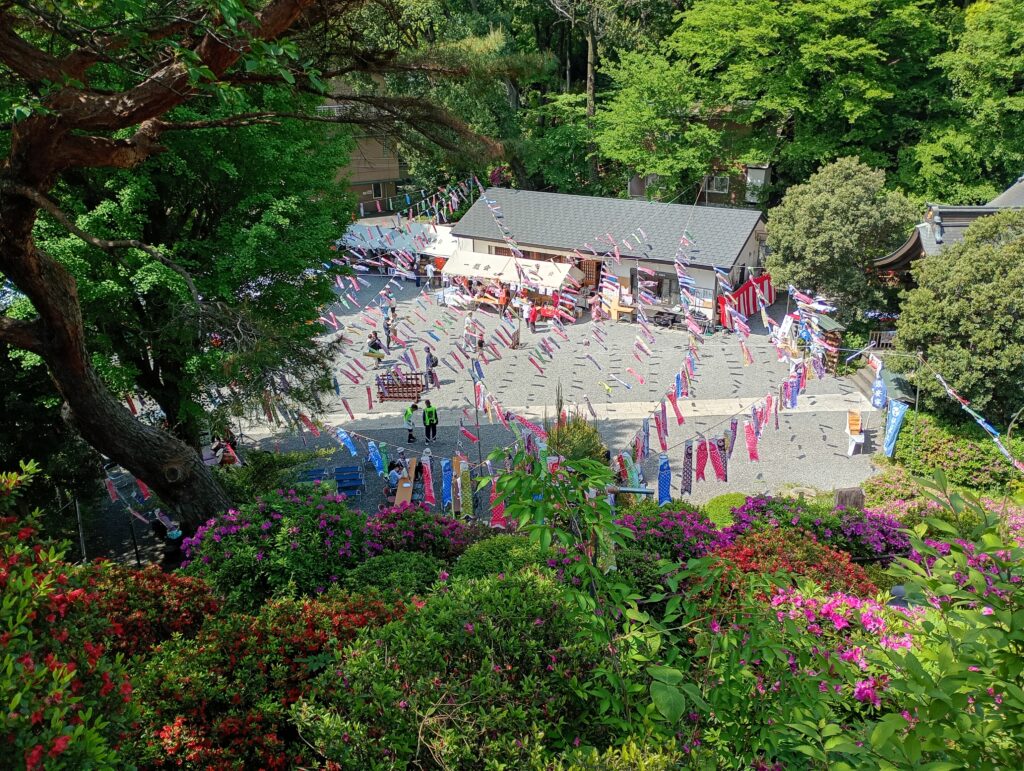 実際に登ってみると、そのどっしりとした存在感に圧倒されます。山頂からは色鮮やかに咲くつつじと共に、賑わうお祭りの様子を一望することができました。