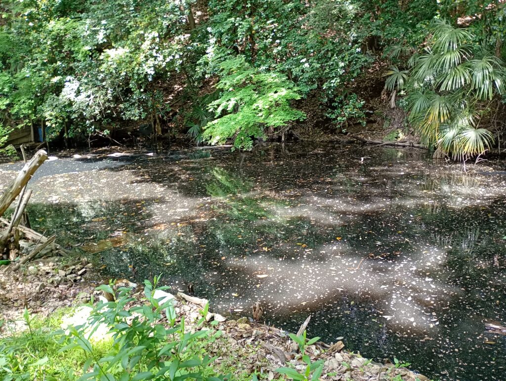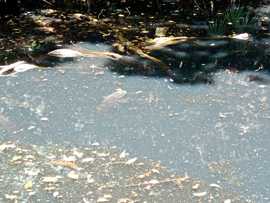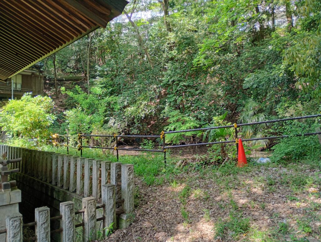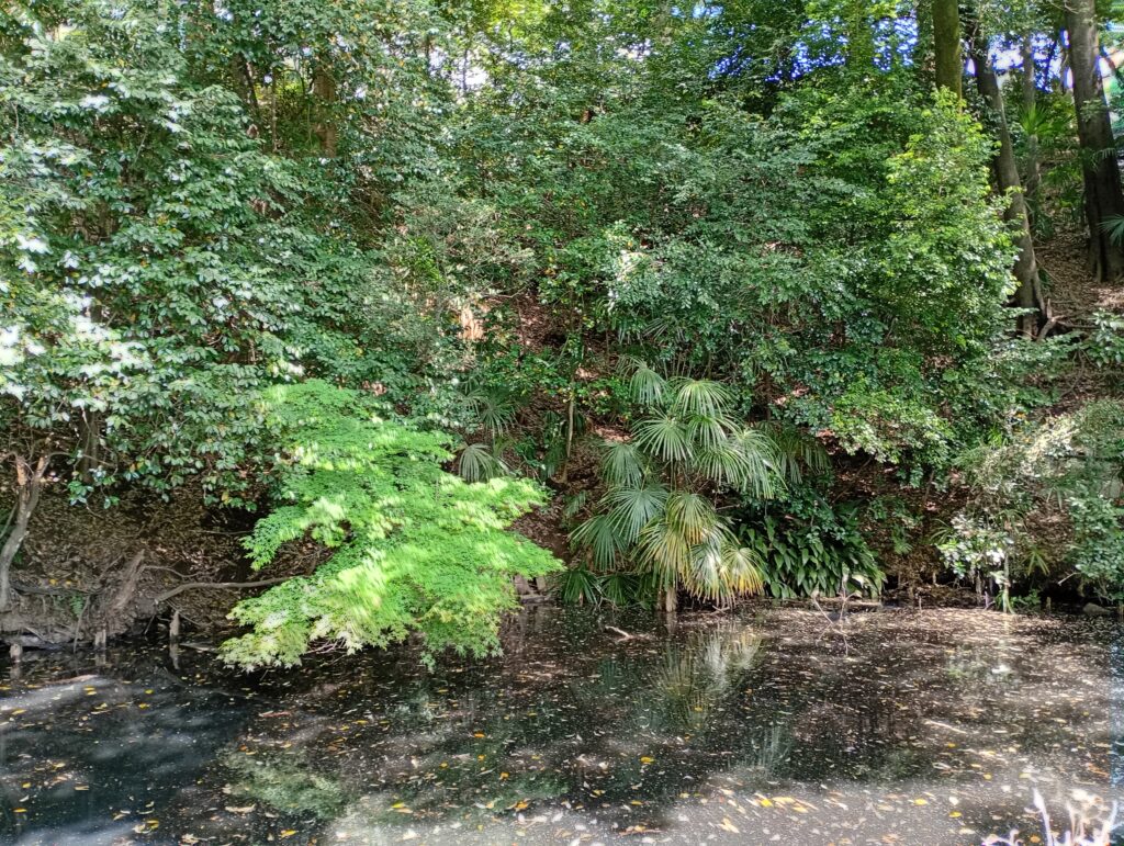 そんな喧騒から少し離れ、八代の裏手にある池へ足を運んでみました。 現在はひっそりとした佇まいの池ですが、水面をよく見るとザリガニや鯉が泳ぎ、静かな波紋が広がっています。実はこの場所には、今の姿からは想像もつかないほど壮大な歴史が眠っています。