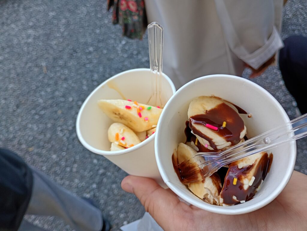 富士山自体は望めずとも、ここで頂くチョコバナナの味は、お祭りならではの特別な楽しみとなりました。