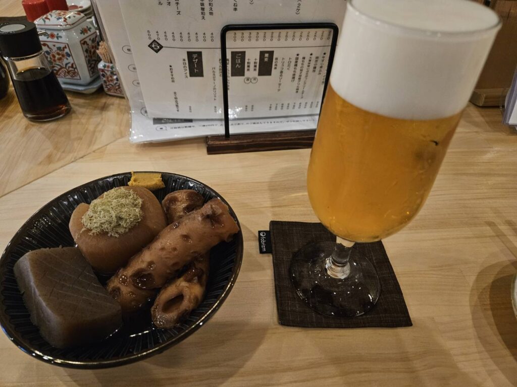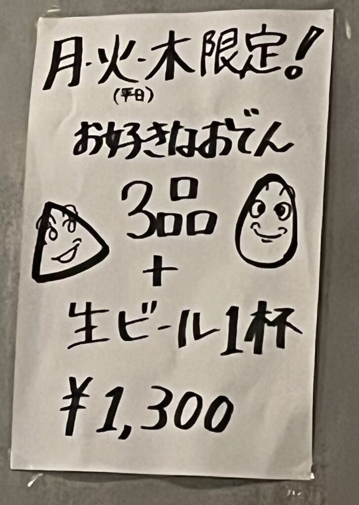2025年7月ころにおでんとビールの1,300円セットが平日限定で提供されていました。