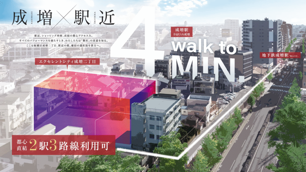 エクセレントシティ成増二丁目は新日本建設が売主・設計・施工・販売・管理・アフターサービスを一気通貫で担うマンションになります。地下鉄成増駅から川越街道沿いをまっすぐ進んで少し小道に入った場所になりますので、徒歩でも4分程度の好立地となります。