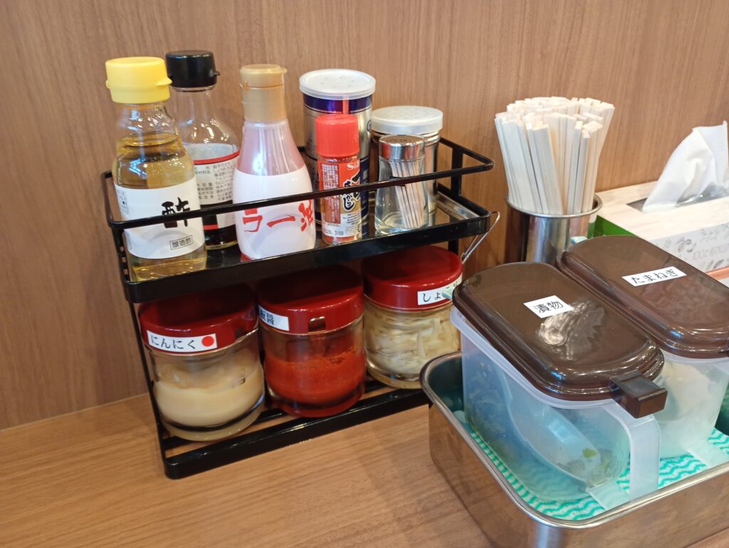 トッピングや味の調整も楽しめます。生の玉ねぎやしょうが、にんにく、豆板醤と味を変えられるのはありがたいですね。