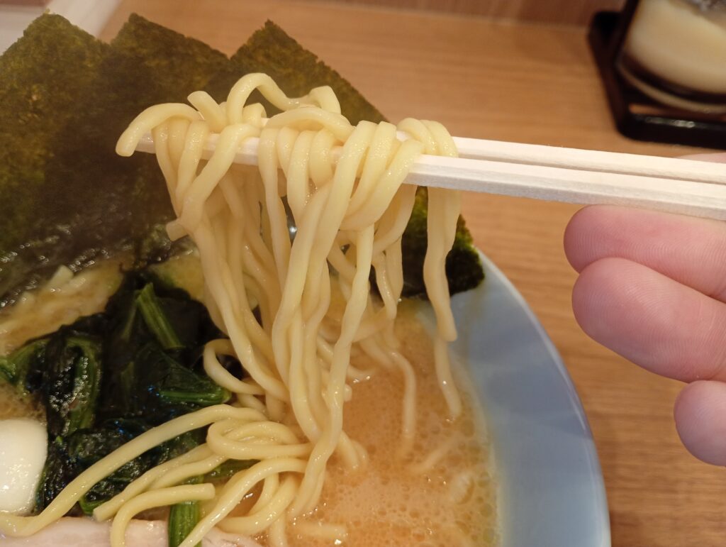 麺は家系特有の中太麺です。スープとよく絡んで、麺に味がのっている感じがしました。割と柔らかい麺なので、ファミリー層向けなのかもしれませんね。