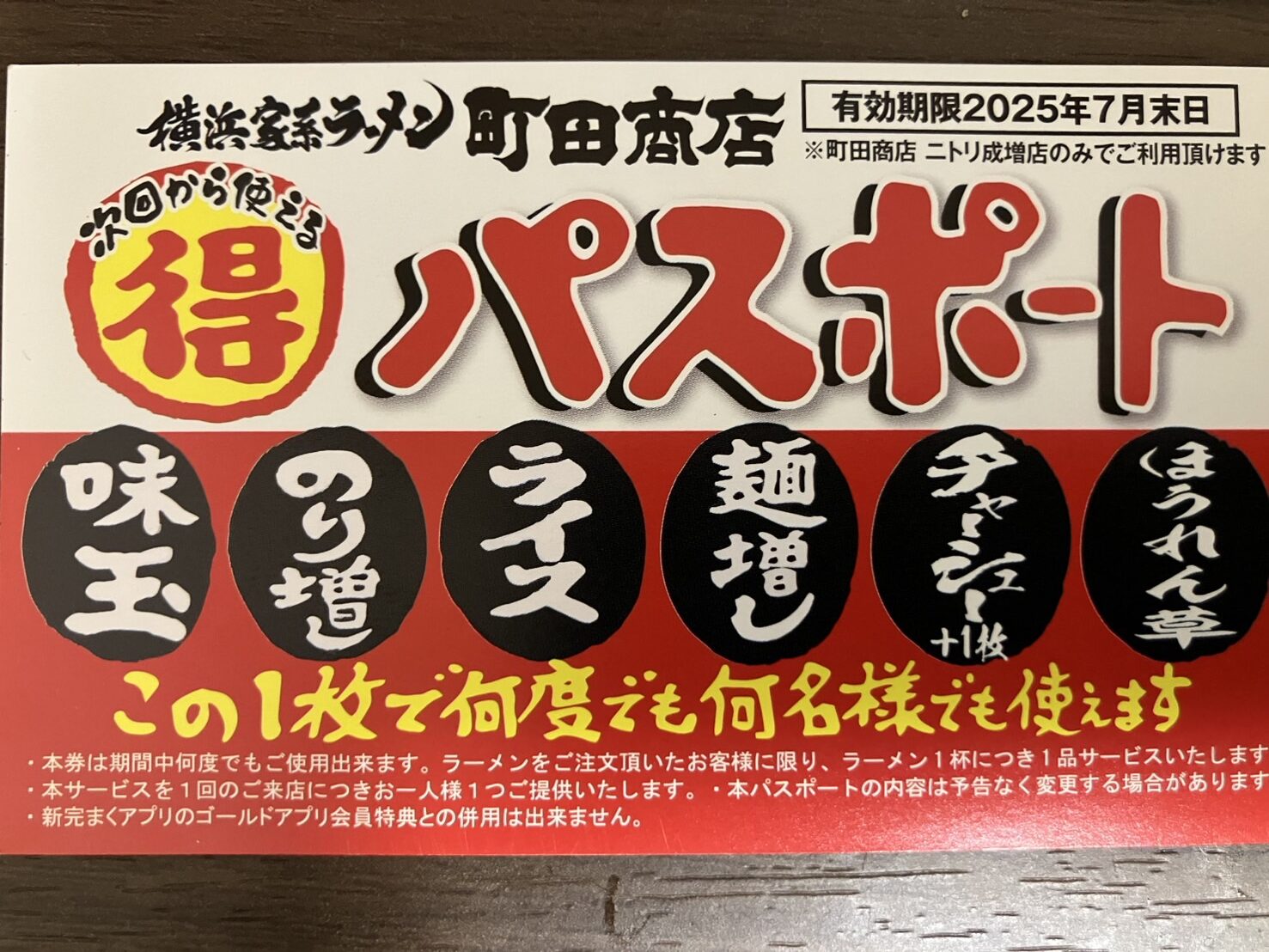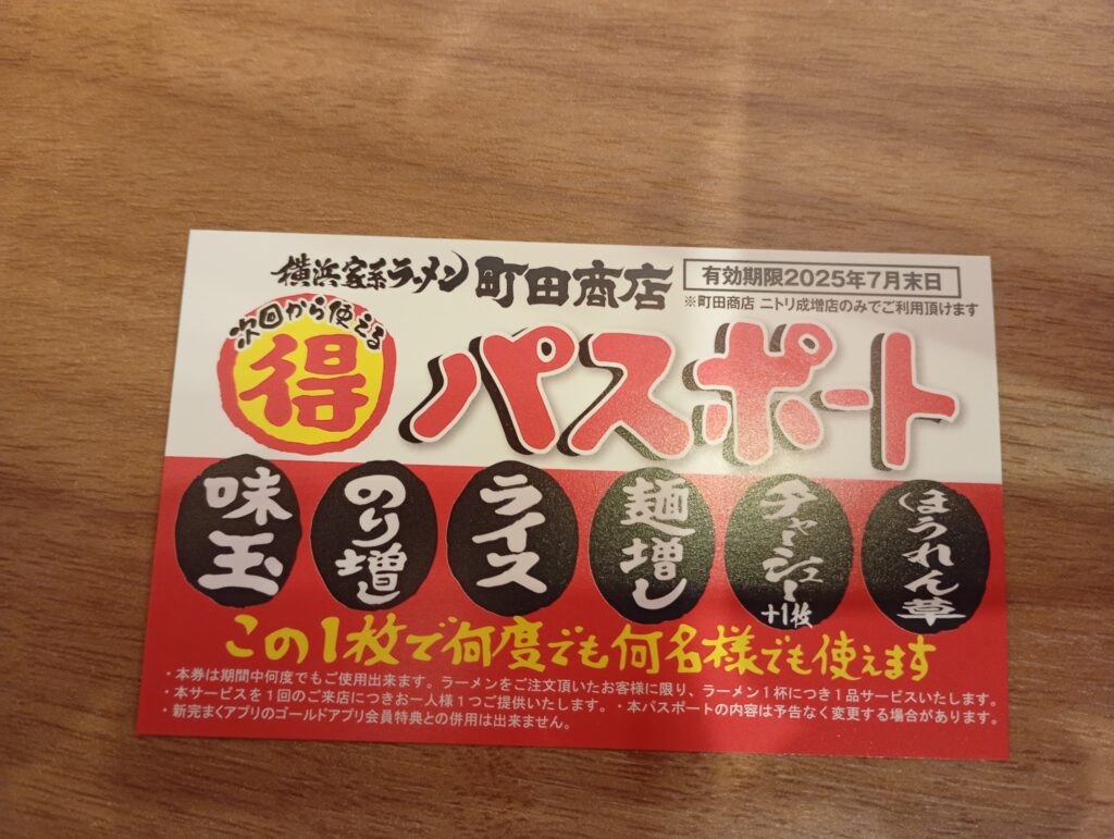 町田商店に先ほど行ったところ、まだオープン記念のトッピングパスポート貰えました。7末まで何度でも使えるようなので気になる方は是非っ!